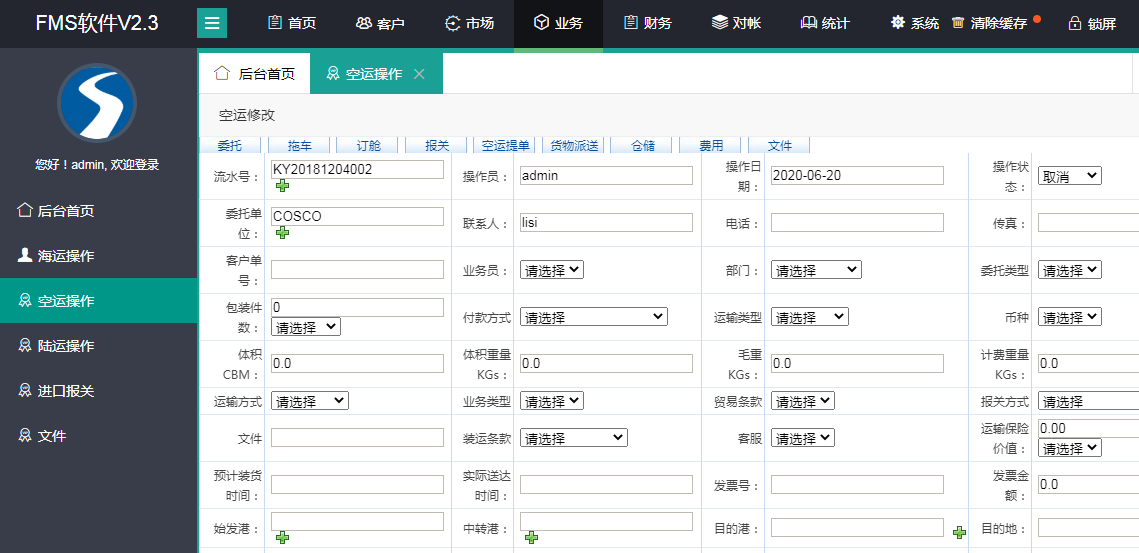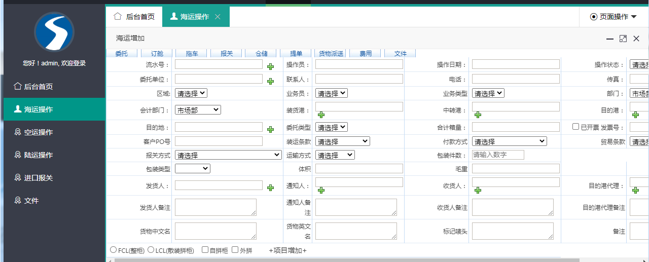 委托,认舱,拖车,报关,仓储,物资派送,应收,应付,文 件管理等功能。